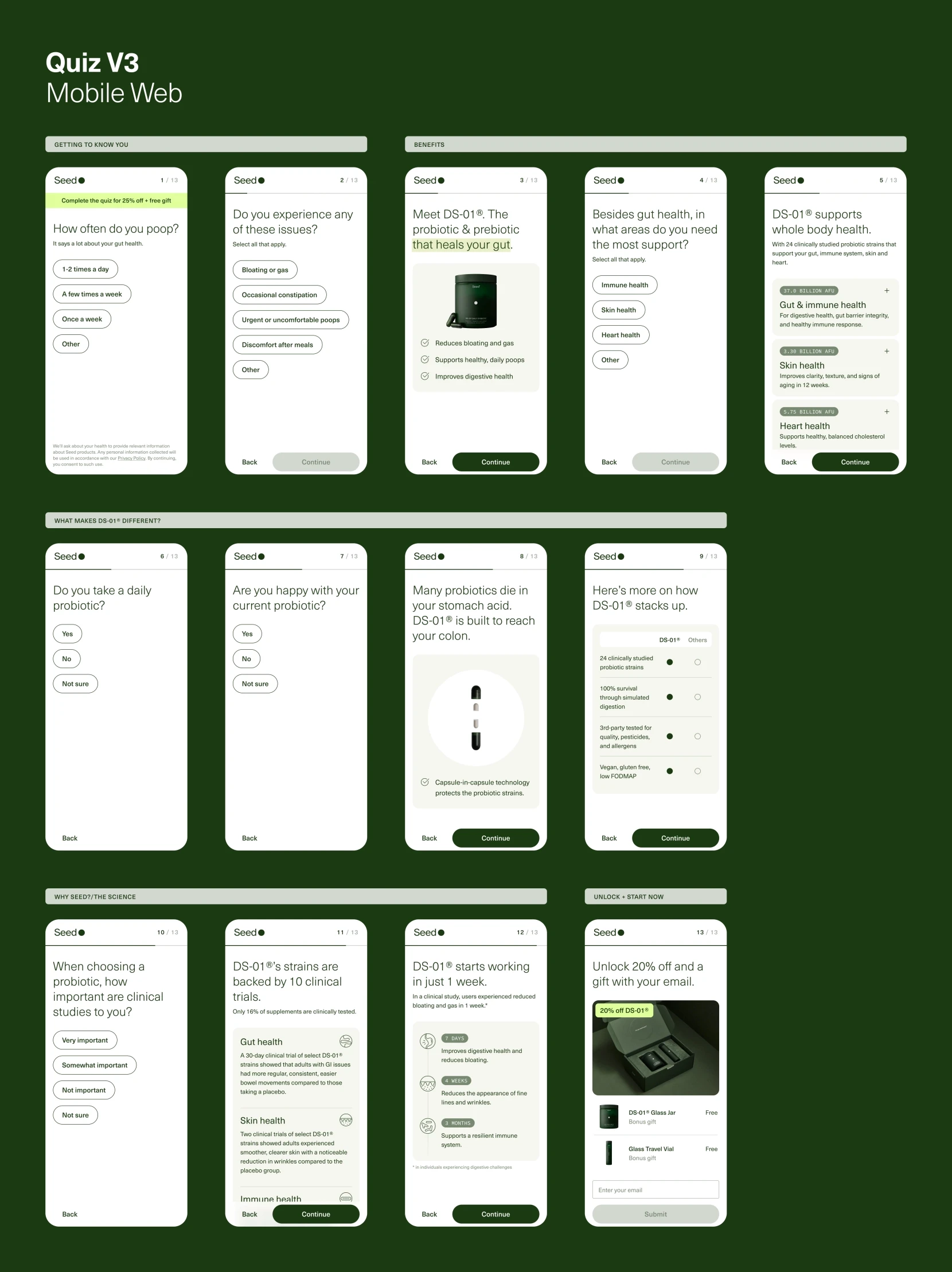 Helping to reimagine the Quiz flow became instrumental to informing the PDP redesign above. Iterating on the length of the quiz and how we framed the content gave us learnings to create a high-performing DS-01® product page. Compared to their previous quiz, the redesign drove a +45% improvement from starting the quiz to order completion and a +25% improvement in email submissions.