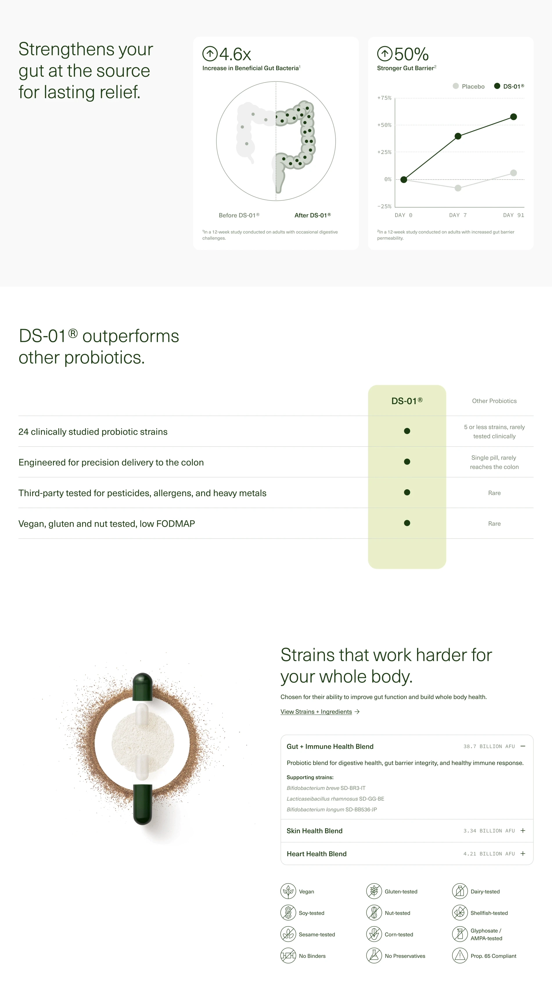 If a user is still scrolling, we wanted to validate our claims by showing the science — and strains — behind the proof, along with how it compares to not only placebo in studies but also competing probiotics.