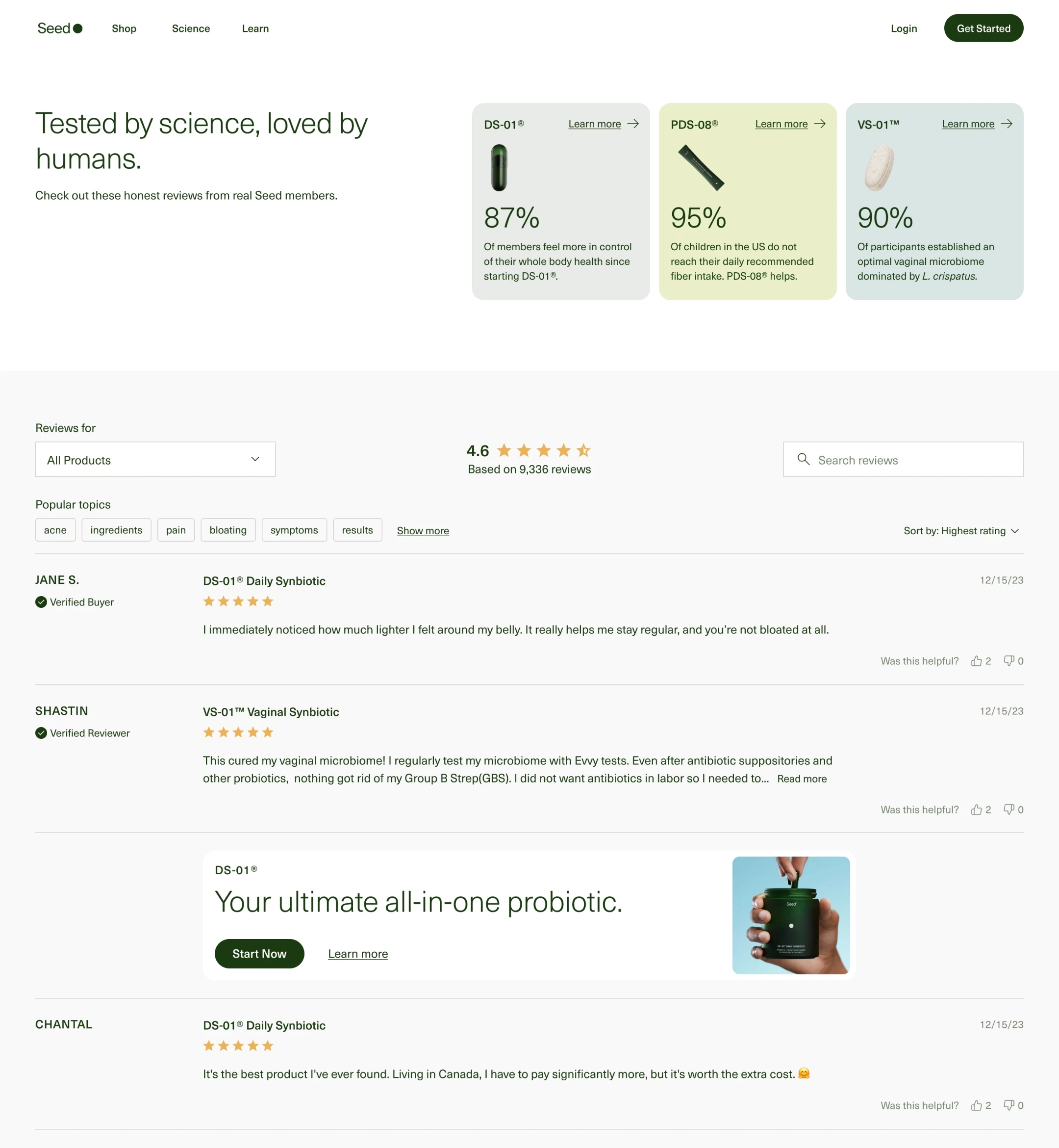 I worked with Seed Health's heads of design and product on redesigning the product detail page for their hero product DS-01®, with the aim of increasing conversion and creating a scalable template that could expand their product offerings. The work I did helped drive a massive +16% to target subscriber volume of their Daily Synbiotic and a successful launch for a new line of Co-Biotics.