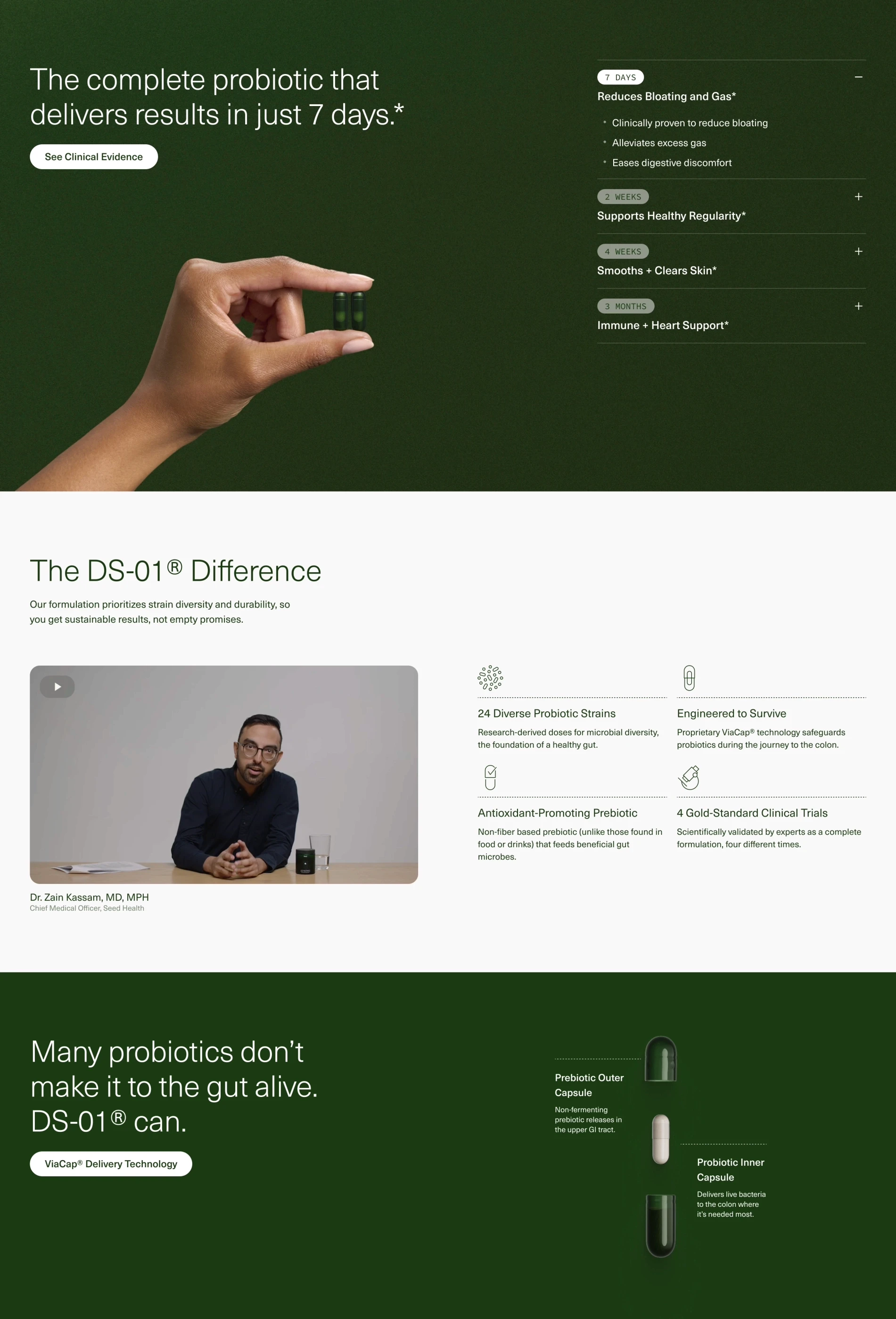 The next sections in the DS-01® PDP focused on making the science and proof-points easier to understand. We learned what converted best here by implementing a quiz flow on the homepage, and iterating into a content strategy that converted. We combined product benefits with a timeline of results, broke down the product differentiation with a video providing expert credibility, and designed an on-scroll animation demonstrating the capsule-in-capsule technology.