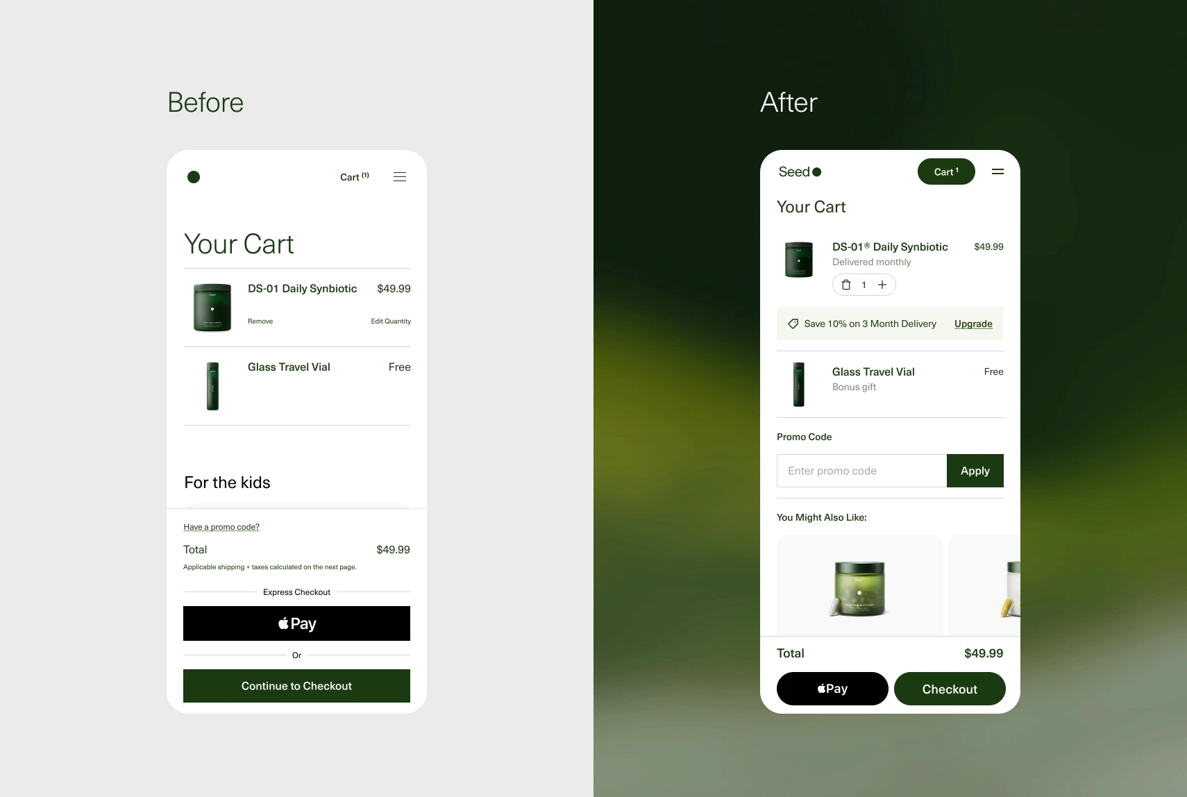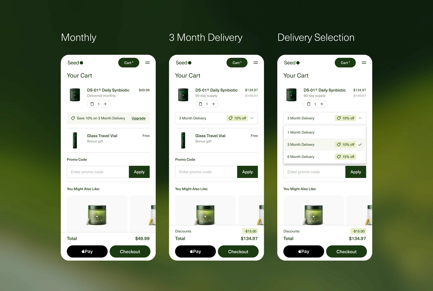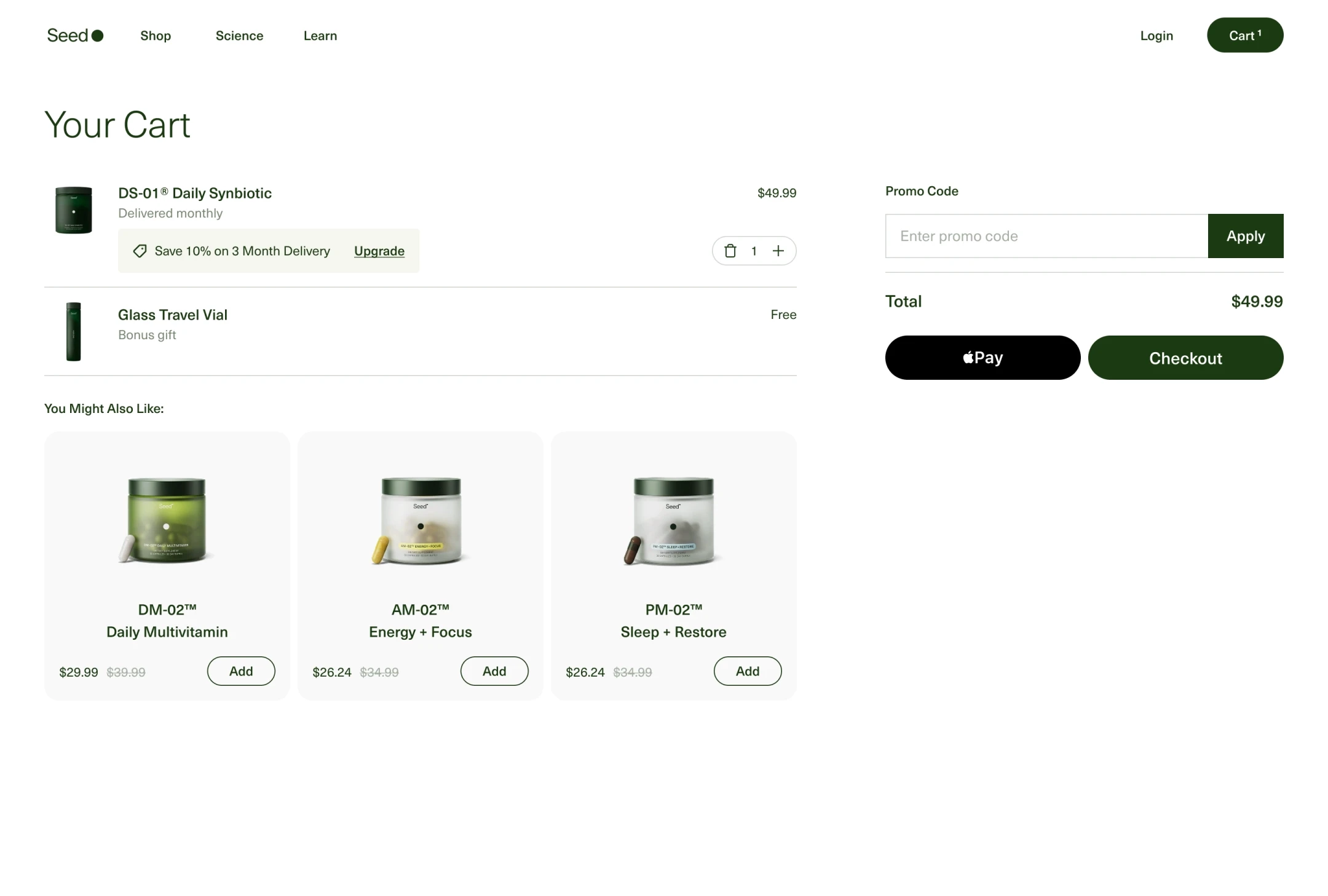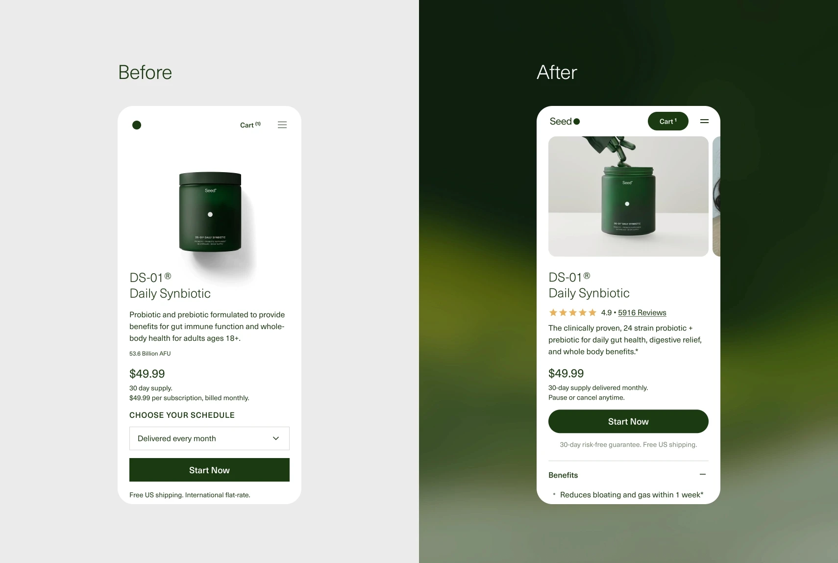 Moving the subscription selection to the Cart reduced complexity from the PDP and allowed for room to make an actual upsell by advertising the discounted price. Dialing in spacing and reducing the size of sticky elements allowed for the cross-selling of Seed's new Co-Biotics products to appear above the fold.