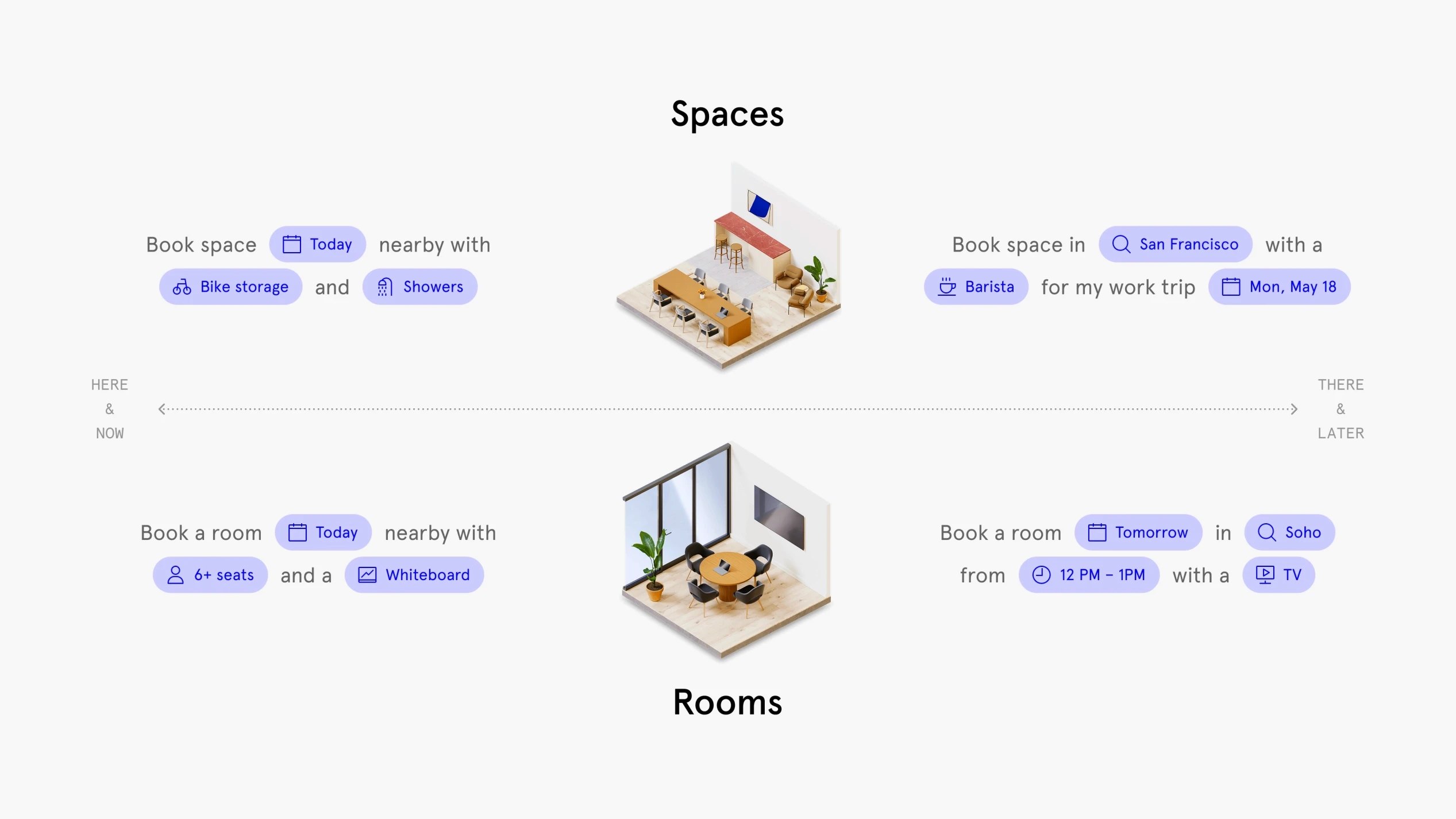 At WeWork, I owned design and strategy for a new pay-as-you-go product, WeWork On Demand, from concept and proposal, through research and testing, to shipped MVP and globally scaled offering.